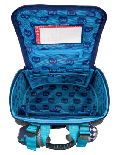 • Vnútri aktovky je priehľadné vrecko s rozvrhom a vnútorný organizér umožňujúci rovnomerné rozloženie hmotnosti, doplnený gumičkou na fixáciu.
