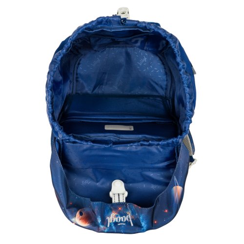 • Jednokomorové vnútorné usporiadanie s vreckom a gumičkou na uchytenie dosiek na chrbtovej strane slúži na jednoduchú organizáciu všetkých školských pomôcok.