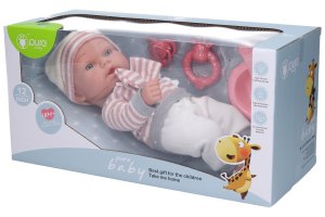 Bábätko. Veľkosť 30cm. Príslušenstvo: cumlík, hrkálka, miska s príborom.