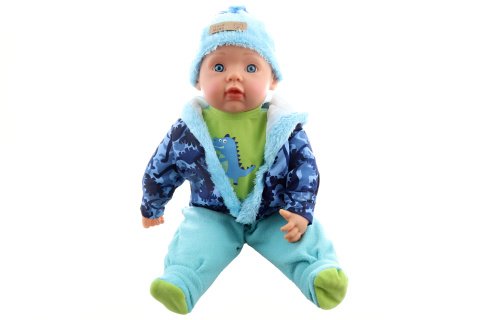 Bábika veľká - bábätko chlapec - s mäkkým telom o veľkosti cca 50 x 33 x 13 cm. Oblečenie je možné zložiť. Materiál plast+polyester+výplň. Konce končatín a hlava sú z plastu. Balené v sáčku. Vek 3+