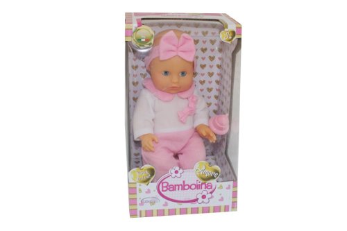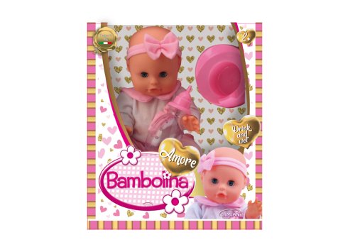 Bábätko Bambolina Amore o veľkosti 33 cm je ideálny pre deti od 2 rokov, ktoré sa chcú hrať na mamičku a starať sa o svoje bábiky. Bábika má pevné telíčko, čo jej dodáva stabilitu, a hlavička, ručičky a nožičky sú vyrobené z kvalitného vinylu, čo jej dodáva realistický vzhľad a odolnosť. Bábätko vie čúrať, čo pridáva na interaktivite a umožňuje deťom simulovať skutočnú starostlivosť o bábätko. Súčasťou balenia je fľaštička a nočník, ktoré deti môžu používať pri hre na kŕmenie a trénovanie používania nočníka. Bambolina Amore je skvelý spoločník na hranie a rozvoj predstavivosti a jemnej motoriky.