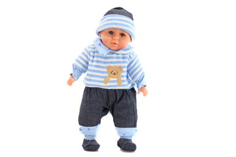 Bábätko s mäkkým telíčkom. Bábätko je oblečené do farebného pyžamka, ktoré je možné zložiť (suchý zips). Rozmery bábätka cca 35 x 17 x 8 cm. Balené v plastovom sáčku. Vek 3+