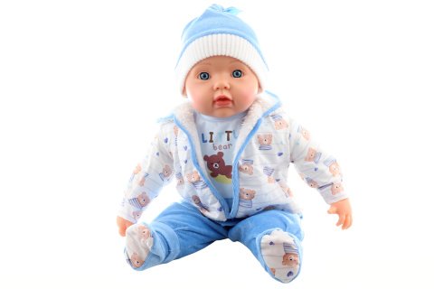 Bábätko - chlapček v krásnom oblečení s motívom medvedíkov. Bábätko má mäkké telíčko, hlavičku a časti končatín z tvrdšieho plastu. Veľkosť bábätka cca 50 cm. Balené v sáčku. Vek 3+
