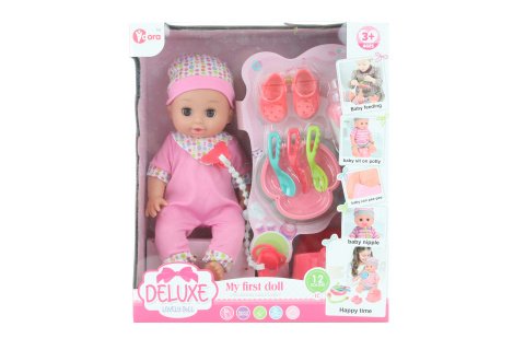 Bábätko s doplnkami. Bábika po vložení batérií vydáva zvuky a ciká. Balenie obsahuje aj nočník, topánočky pre bábiku, fľaštičku, tanierik a ďalšie doplnky. Napájanie na 3 batérie AG13 (sú súčasťou balenia). Rozmery bábätka cca 28 x 10 cm. Rozmery balenia cca 35 x 30 x 13 cm. Vek 3+
