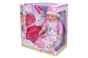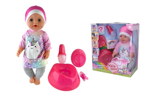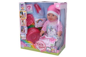 Bábätko čúrajúce s príslušenstvom. Veľkosť 45 cm. Príslušenstvo: nočník, miska s lyžičkou, fľaštička na kŕmenie, plienka, krabička s prekvapením, cumlík, preukaz. Bábätko sa nakŕmi vodou pomocou fľaštičky. Po stlačení ruky mu tečú slzy. Po stlačení pupka čúra. Pri položení na chrbát zavrie oči.