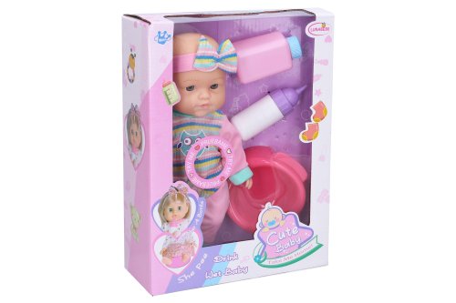 Bábätko cikajúce. Veľkosť 25cm. Obsahuje bábätko, fľaštičku na pitie, púder, nočník. Zvukové efekty, aktivácia tlačidlom na brušku. Pije a ciká. 3xAG13 batérie súčasťou.