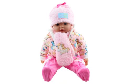 Bábika veľká - bábätko holka - s mäkkým telom o veľkosti cca 50 x 27 x 13 cm. Oblečenie je možné zložiť. Materiál plast+polyester+výplň. Konce končatín a hlava sú z plastu. Balené v sáčku. Vek 3+