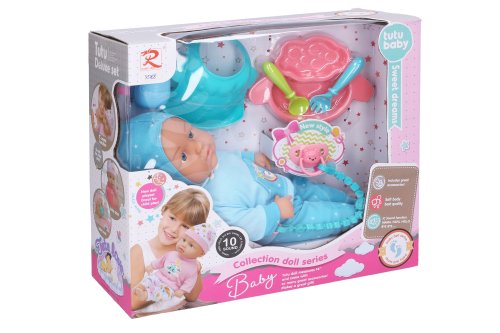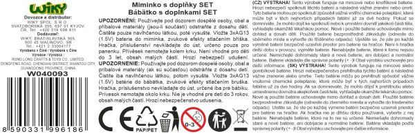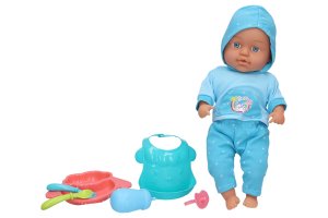 Bábätko mäkké s doplnkami. Veľkosť 30 cm. Mäkké telo. Zvukové efekty stlačením bruška. 3xAG13 batérie súčasťou. Obsah - bábätko, cumlík, podbradník, fľaša, miska, lyžica, vidlička.