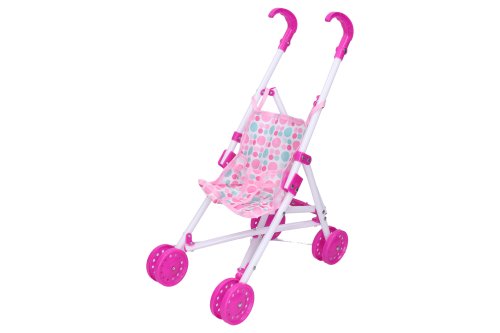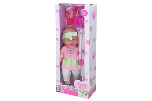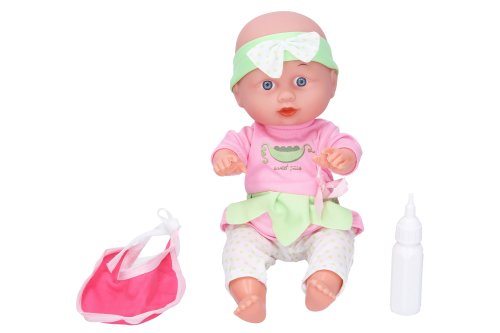 Bábätko s kočíkom. Veľkosť 28 cm. Balenie obsahuje bábätko, zložený kočík, podbradník a fľaštičku.