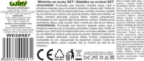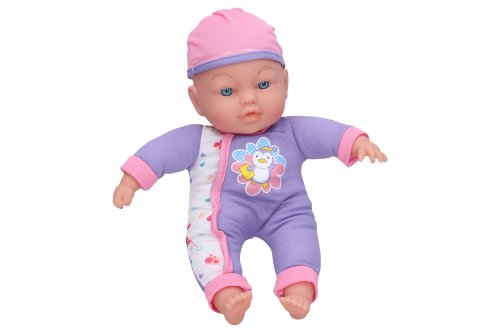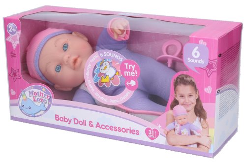 Bábätko so zvukovými efektmi. Veľkosť 31 cm. Mäkké telíčko. Zvukové efekty stlačením bruška (6 zvukových efektov). 2xAG3 batérie súčasťou. Súčasťou fľaštička, cumlík.