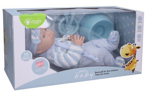 Bábätko v overale modrej. Veľkosť 40 cm. Obsahuje: bábätko, nočník, miska, príbor, cumlík.