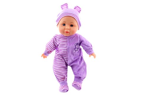 Bábätko s mäkkým telíčkom. Po stlačení telíčka začne bábätko vydávať zvuky (smiech, plač, mama, tata). Bábätko je oblečené do farebného pyžamka, ktoré je možné zložiť (suchý zips). Rozmery bábätka cca 30 x 15 x 6 cm. Balené v plastovom vrecku. Prevádzka na 3 gombíkové batérie. Vek 3+