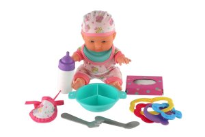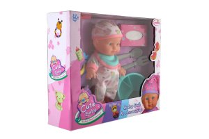 Roztomilá bábika s pevným telíčkom. Toto bábätko urobí určite radosť každému dievčatku a stane sa tak jej nepostrádateľnou súčasťou. Súčasťou balenia je fľaštička, hrkálka, obrúsky a jedálenský set pre batoľatá, ktoré určite každá mamička pre svoje bábätko nutne potrebuje. Veľkosť bábiky: 22 cm Rozmer balenia: 30 x 24 x 8 cm. Vhodné pre deti od 3 rokov.