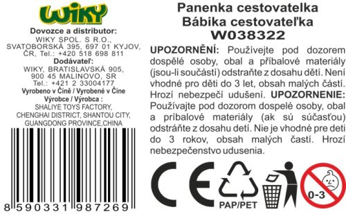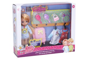 Bábika cestovateľka. Veľkosť bábiky 13cm. obsahuje: bábiku, cestovný kufor, 2oblečky, 2hrebene, kabelku, korunku