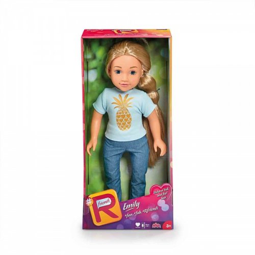 Pozdravte sa s Emily, 46 cm vysokou bábikou s nádherne dlhými blonďatými vlasmi dlhými 33 cm. Emily miluje čas strávený so svojimi priateľmi. Po škole spoločne zájdu na koktail, potom do parku a večer všetci vyrazia do kina. Emily je oblečená v roztomilom tričku s ananásom, v džínsových džegínach a má obuté bledomodré topánky. Bábiku možno ľahko prezliekať. Dlhé, realistické vlasy je možné upravovať do vrkočov. Inšpiráciu a návody na účesy nájdete v priloženej brožúre. Rozmer balenia: 50 x 23 x 11 cm. Vek: 3+