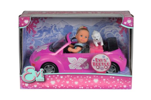 Bábika Evička v novom aute New Beetle ide so svojim psíkom na výlet! Dĺžka auta: 22 cm. Výška bábiky: 12cm.