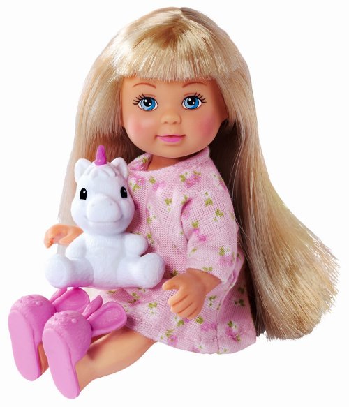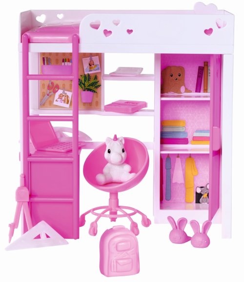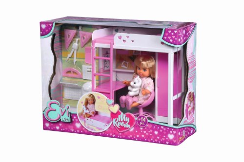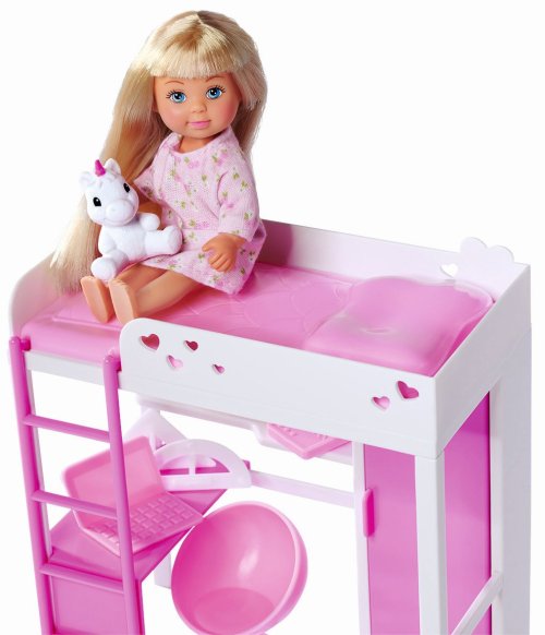 Bábika Evička s vysokou posteľou, pracovným stolom, šatníkovou skriňou a ďalším príslušenstvom. Výška bábiky 12 cm.