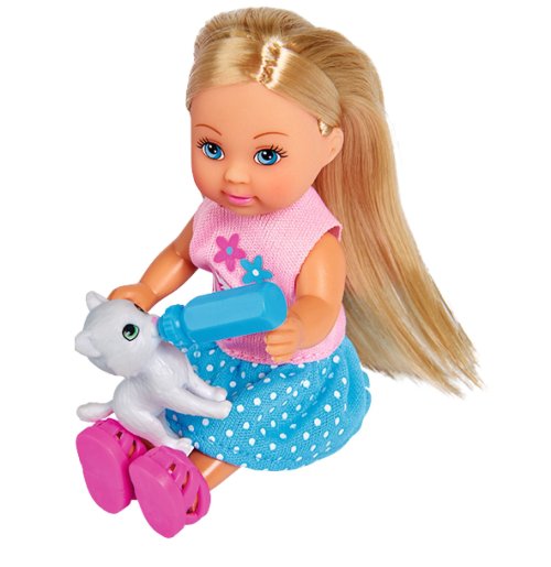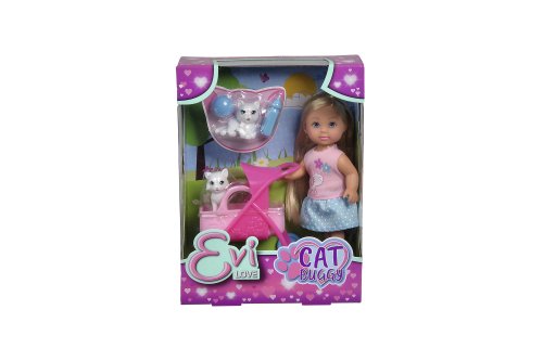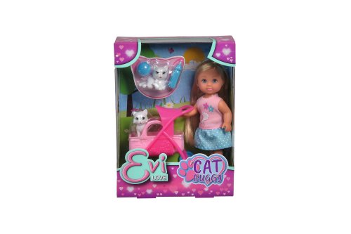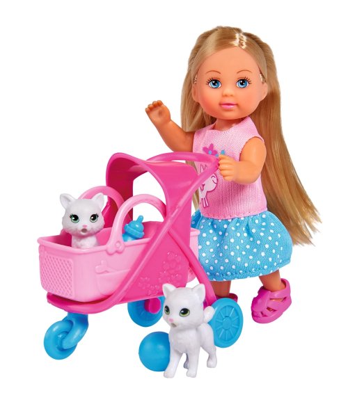 Bábika Evička s 2 roztomilými mačičkami a kočíkom s odnímateľným košíkom a doplnkami. Veľkosť bábiky 12 cm.