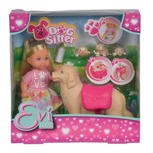 Bábika Evička so svojím psíkom a 3 šteniatkami. Príslušenstvo súčasťou. Veľkosť bábiky 12 cm.