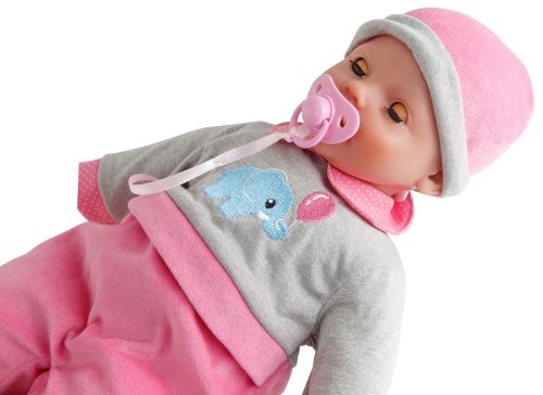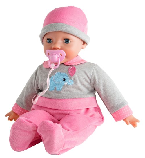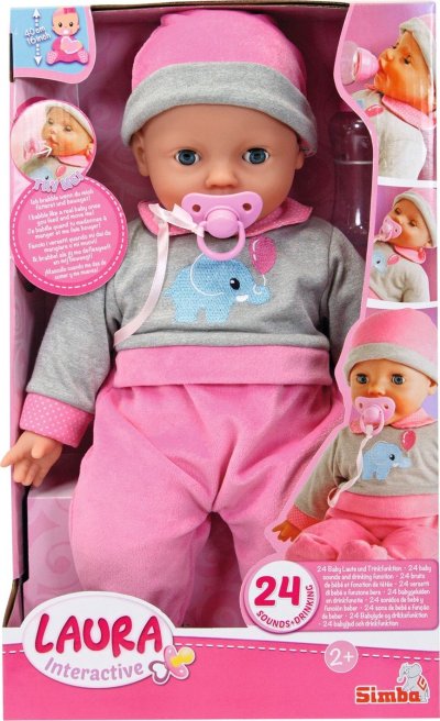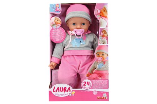 Bábika Laura má mäkké telíčko, zatváracie očíčka, pije z fľaštičky a vydá 24 detských zvukov. Fľaštička a cumlík súčasťou. Veľkosť bábiky 40 cm.