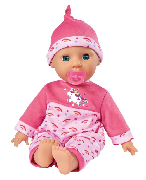 Bábika s mäkkým telíčkom, s 25 detskými zvukmi ako „mama“, „baba“, „hihi“ a mnohými ďalšími, s cumlíkom, žmurkacími očami. Výška bábiky 38 cm.