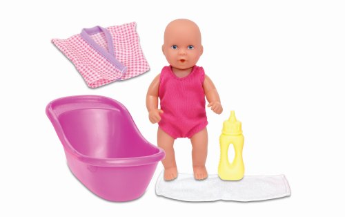 Bábika, ktorá pije a ciká s doplnkami na kúpanie. Set obsahuje: fľaštičku a vaničku vrátane uteráka a županu. Výška bábiky 12 cm.