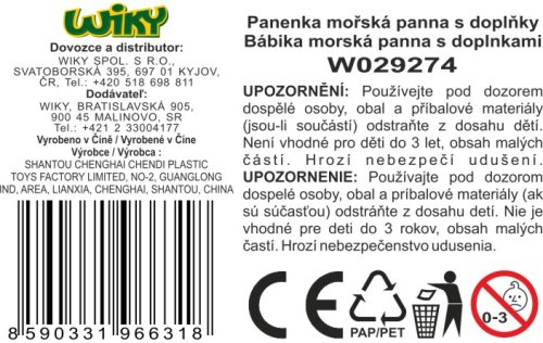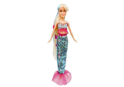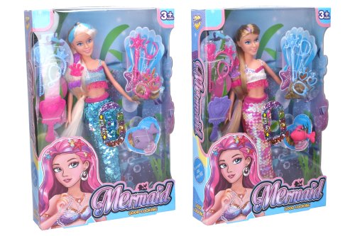 Bábika morská panna s doplnkami. Veľkosť 29cm. Doplnky: šperky pre bábiku, figúrka delfína, hrebeň na vlasy. Asort: modrá, ružová