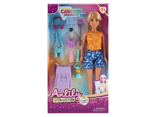 Bábika Anlily v sade Camping holiday s doplnkami. Bábika má na sebe kraťasy a top. Doplnky: foťák, kabelka, slúchadlá, slnečné okuliare, náhrdelník a žabky. Výška bábiky: 30 cm. Rozmery balenia: 32 x 18 x 5 cm. Vek: 3+