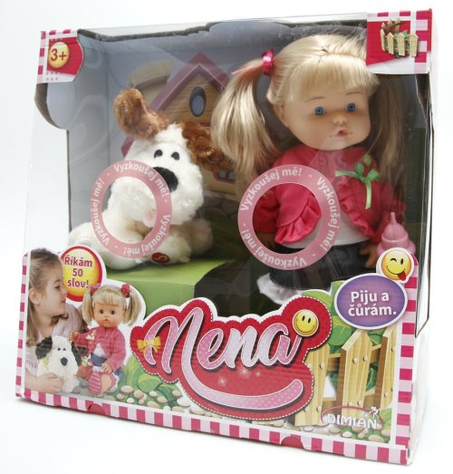 Bábika Nena je skvelá interaktívna hračka pre deti, ktoré sa chcú hrať na mamičku a starať sa o svoje bábätko. Bábika o veľkosti 36 cm vie povedať až 50 slov, čo ju robí zábavnú a realistickú. Nena pije z fľaštičky a dokáže tiež cikať, čo pridáva na realistickosti hry. Súčasťou balenia je okrem bábiky aj roztomilý psík a fľaštička na pitie, vďaka čomu si deti môžu vymýšľať rôzne príbehy a situácie, ktoré budú obohatené o nové zážitky a radostné chvíle.