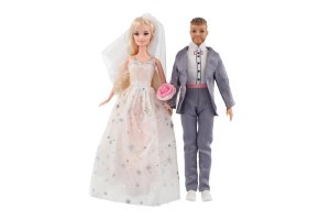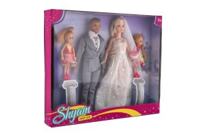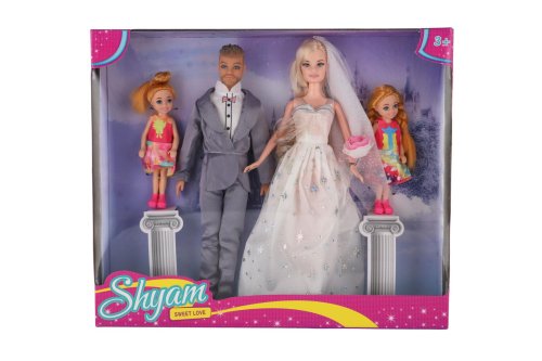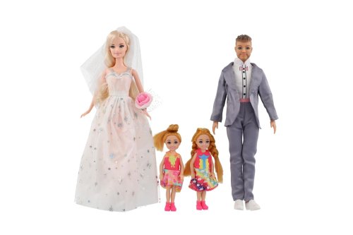 Sada bábik - Nevesta, ženích a ich deti . Elegantná sada figúrok pre hravé deti s témou svadby a rodiny. Obsahuje nevestu v krásnych bielych šatách, ženícha v obleku a dve malé deti - všetko zladené do sviatočného vzhľadu. Ideálne ako darček alebo doplnok k bábikovému svetu.