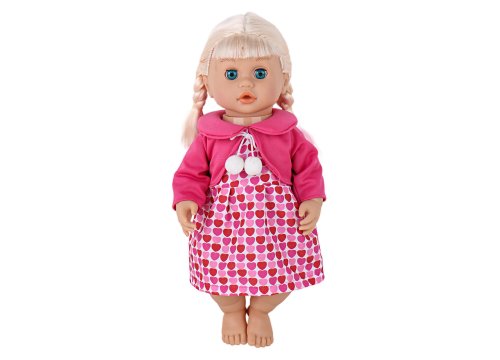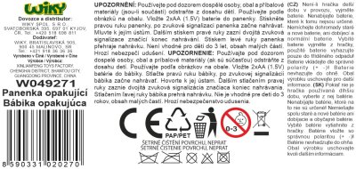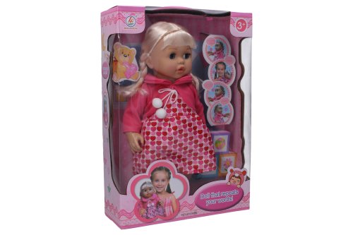 Bábika opakujúce. Veľkosť 40cm. 2xAA batérie nie sú súčasťou. Návod na obale. Po stlačení pravej ruky zaznie zvuk a bábika začne nahrávať. Hovorte k bábiným ústam. Ďalším stlačením pravej ruky zaznie dvojitý zvuk a nahrávanie je na konci. Stlačením ľavej ruky bábika prehrá nahrávku.