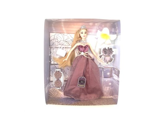 Bábika vysoká približne 30 cm je navrhnutá ako elegantná módna figúrka, ktorá upúta pozornosť svojimi luxusnými plesovými šatami v odtieni tmavej purpurovej s jemným leskom. Šaty majú korzetový vršok s výraznou mašľou v páse, ktorá ladí s celkovým vzhľadom a dodáva bábike slávnostný a noblesný vzhľad. Vďaka priehľadnej vrstve látky na sukni pôsobia šaty veľmi vzdušne a noblesne, čo podčiarkuje ich vhodnosť na rôzne rozprávkové či slávnostné príležitosti.