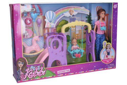Bábika s dieťaťom na ihrisku. Veľkosť bábiky 30 cm, Obsahuje Bábiku, dievčatko, hojdačku, šmykľavku, hojdacieho koníka, šteniatko a doplnky.
