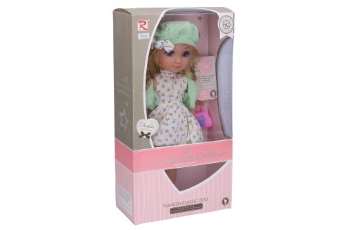 Bábika s kabelkou, čiapkou a zvukovými efektmi. Veľkosť 36 cm. Zvukové efekty stlačením bruška. 3xAG13 batérie súčasťou. Súčasťou hrebeň a kabelka.