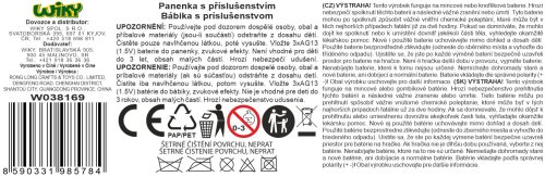 Bábika s príslušenstvom. Veľkosť 35cm. Zvukové efekty. Obsahuje bábiku, príslušenstvo pre bábiku aj pre dievčatko, kabelku na uloženie príslušenstva. 3xAG13 batérie súčasťou.