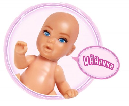 Akonáhle príde dieťatko na svet, vykukne z bruška a dá o sebe vedieť krikom. Bábika má ohybné kĺby na lakťoch a zápästiach , aby mohla drobčeka správať a starať sa o neho. Po stlačení tlačidla na náhrdelníku sa namiesto srdiečka ozve plač, zaspávanie pri uspávanke či smiech novorodenca.