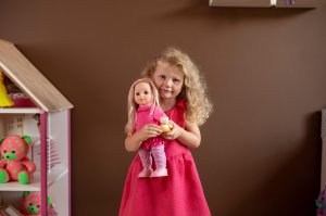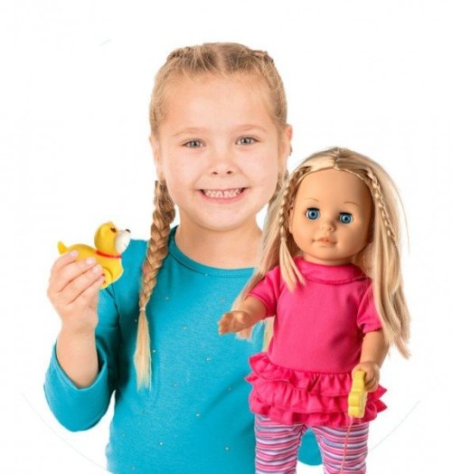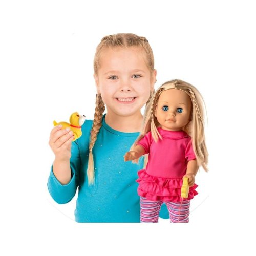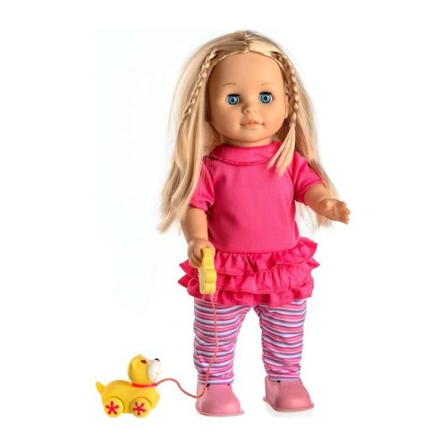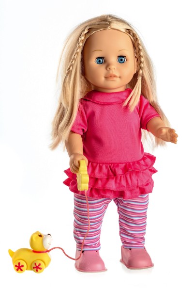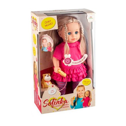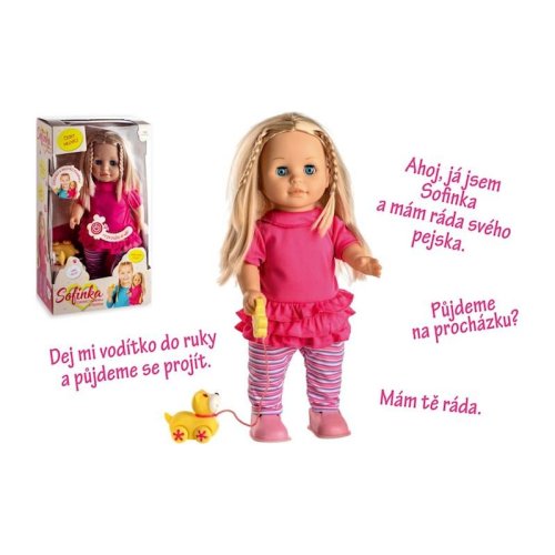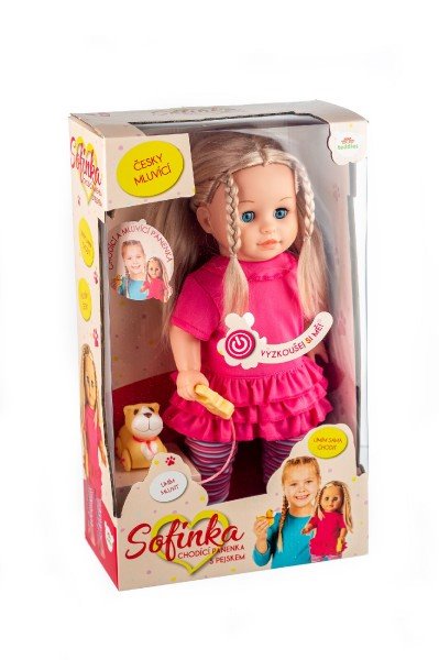Bábika Sofinka s krásnymi dlhými vláskami má k sebe milého kamaráta v podobe psíka na vodítku. Po stlačení tlačidla na brušku začne bábika rozprávať: "Ahoj, ja som Sofinka a mám rada svojho psíka. Pomôžeš mi vymyslieť jeho meno? Budeme sa spolu hrať? Daj mi vodítko do ruky a pôjdeme sa prejsť. Mám ťa rada...." a keď jej dáte vodítko do ruky, začne chodiť, začne chodiť. Rozmer bábiky: 42 cm Rozmer krabice: 26 x 44 x 13 cm Na batérie - 3 ks typu AA 1,5 V - batérie sú súčasťou výrobku Vhodné pre deti od 3 rokov