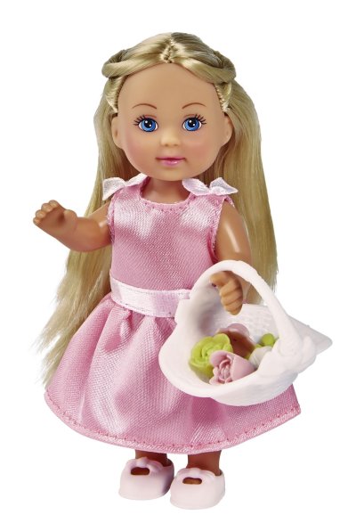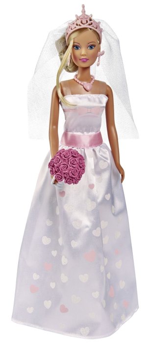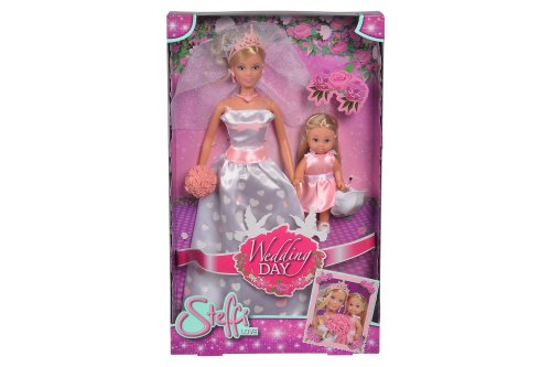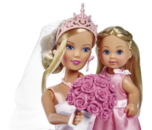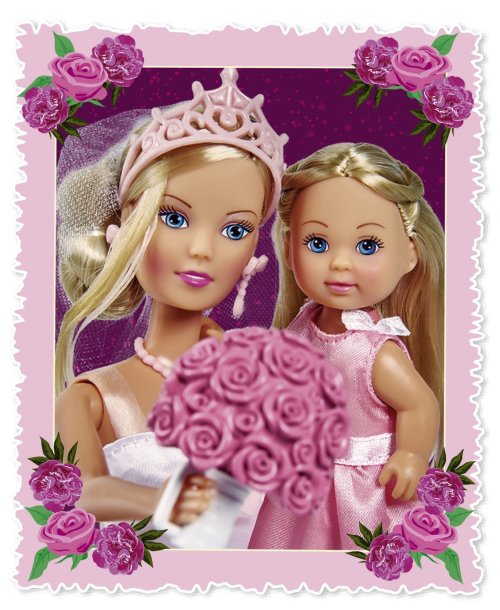 Bábika Steffi s kyticou ruží v nádherných svadobných šatách, s bábikou Evičkou v ružových šatôčkach družičky s košíčkom s kvetmi. Veľkosť bábik 29 a 12 cm.