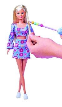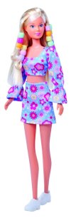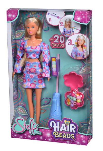 Bábika Steffi v kytičkovom dvojdielnom outfite, s háčikom na navliekanie korálku na prameň vlasov, farebnými korálkami, gumou na fixáciu a hrebeňom s úložným priestorom. Výška bábiky 29 cm.