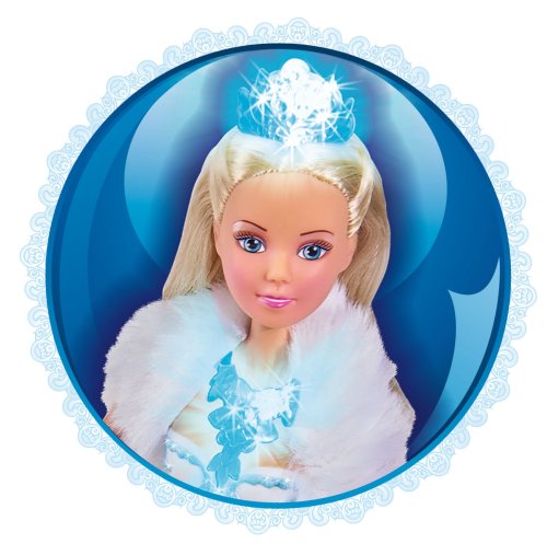 Bábika Steffi ako ľadová princezná s magickou svetelnou funkciou - tiara s náhrdelníkom svieti na batérie a vločky na sukni svieti/fosforeskujú v tme. Veľkosť bábiky 29 cm.