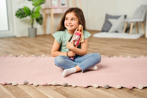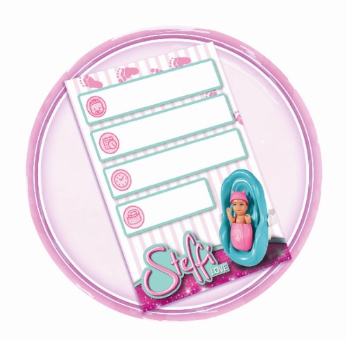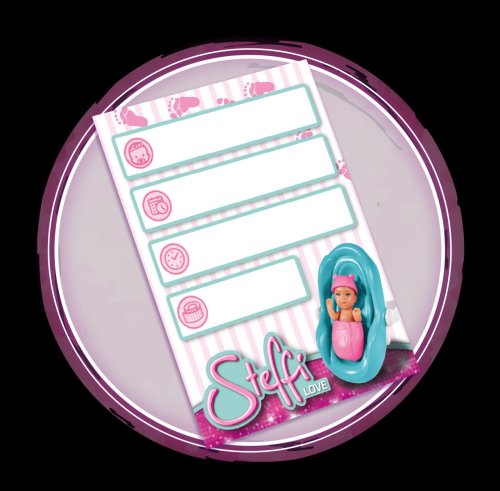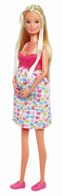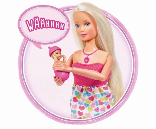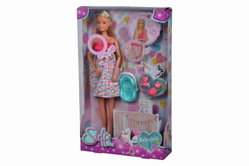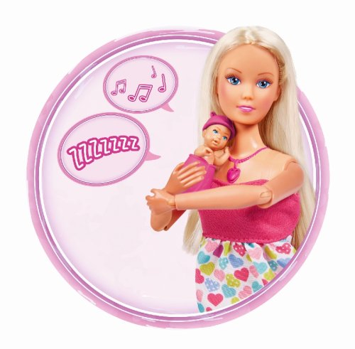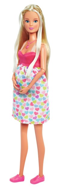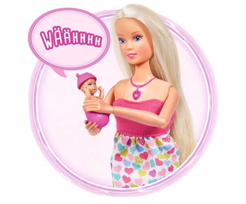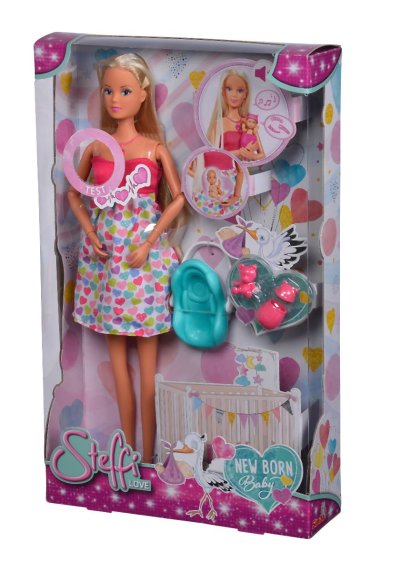 Steffi ako nastávajúca mamička s bábätkom v brušku. Keď stlačíme tlačidlo v tvare srdca na jej náhrdelníku, začujeme tlkot srdca bábätka. Keď sa dieťa narodí a vykukne z bruška, dá o sebe vedieť krikom. Keď potom znovu stlačíme srdiečko na náhrdelníku, postupne začujeme ďalšie zvuky - plač, zaspávanie pri uspávanke a smiech. Sada obsahuje tiež rodný list na vyplnenie, čiapočku a zavinovačku pre novorodencov, hračku medvedíka a detské nosítko. Bábika Steffi má ohybné kĺby na lakťoch a zápästiach. Veľkosť bábiky 29 cm.