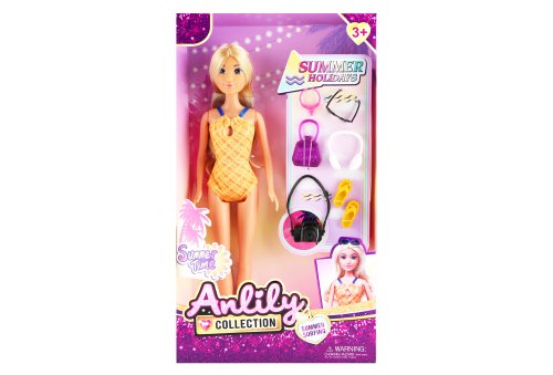 Bábika Anlily v sade Summer holiday s doplnkami. Bábika má na sebe plavky. Doplnky: foťák, kabelka, slúchadlá, okuliare, náhrdelník a žabky. Výška bábiky: 30 cm. Rozmery balenia: 32 x 18 x 5 cm. Vek: 3+