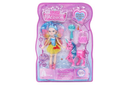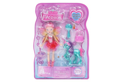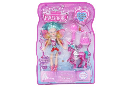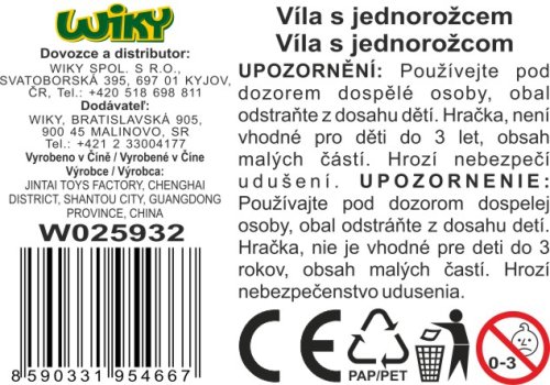 Bábika víla s jednorožcom. Veľkosť bábiky 21 cm. Súčasťou víla, hrebeň, kabelka, jednorožec. 3 farebné varianty jednorožca - fialová, zelená, ružová.