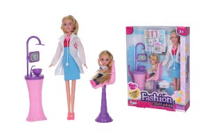Bábika zubárka s dievčatkom. Veľkosť 29 cm. Balenie obsahuje bábiku zubárku, malé bábiku dievčatko a príslušenstvo: lekárske potreby, vybavenie zubárskej ordinácie.