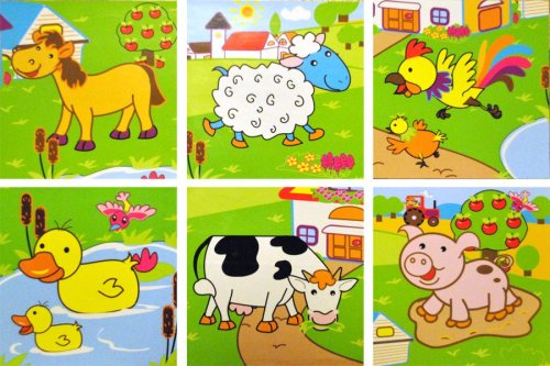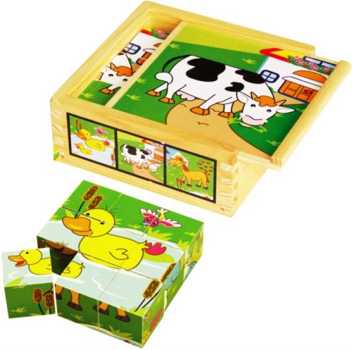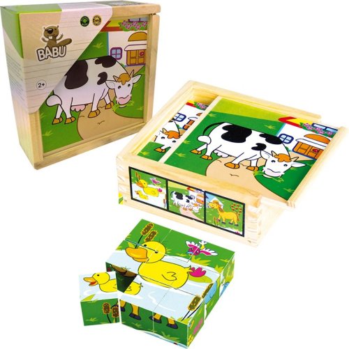 Deväť kociek balených v drevenej krabičke s vekom na stavanie komínov a prvých obrázkov s motívom domácich zvieratiek. Rozmer zloženého puzzle cca 10,5 x 10,5 cm