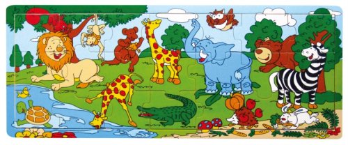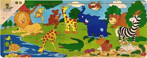 Slon, opička, zebra, žirafy a ďalšie zvieratká veselo šantia vo voľnej prírode. Dokážeš pomenovať aj ďalšie zvieratká na obrázku? Drevené puzzle s 21 dielikmi na drevenej doske s pevným okrajom, ktorá slúži zároveň ako podložka na skladanie. Skladanie puzzle rozvíja detskú fantáziu a podporuje motoriku. Odporúčané pre deti od 2 rokov. Rozmer zloženého puzzle cca 45 x 18 cm