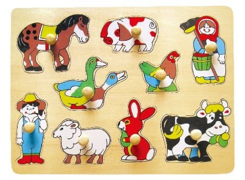 Drevená vkladačka pre malé deti s úchytkami a ôsmimi vkladacími obrázkami zvieratiek a farmárov s farmárkou.