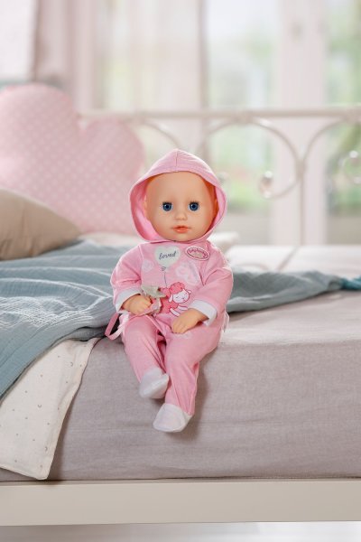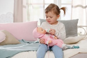 S bábikou Baby Annabell Hannah sa môžu hrať aj tie najmenšie deti. Hannah je vhodná pre deti už od 1 roku. Má mäkké látkové telíčko a 5 realistických interaktívnych funkcií. Keď jej podržíte v ústach fľaštičku, budete počuť roztomilé zvuky pitia. Jemne jej stlačte bruško a povie „aja.“ Keď ju nakloníte doľava alebo doprava, začne čkať alebo sa smiať. Po náročnom dni plnom hraní položte Hannah na chrbát a sledujte, ako zavrie oči, začne unavene oddychovať a zaspí. Hannah si do svojho nového domova prináša fľaštičku, cumlík a roztomilé dupačky s kapucňou. Jednoducho všetko, čo deti potrebujú na hranie s bábikou. Hannah meria 36 cm, čo je veľkosť tak akurát pre menšie deti. Obleček je ušitý v strihu easy fit, vďaka ktorému prezliekanie bábiky ľahko zvládnu aj malé detské ručičky.