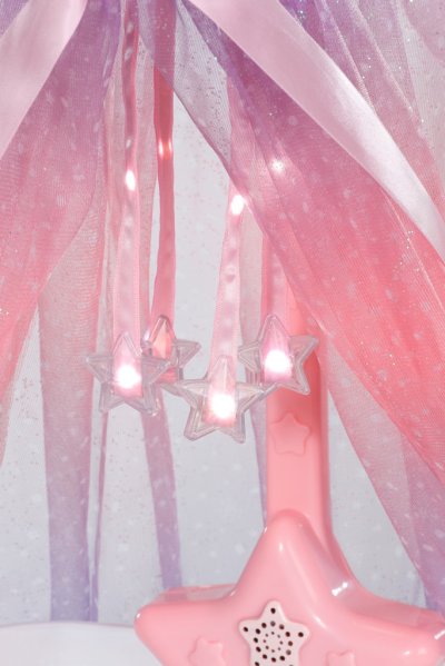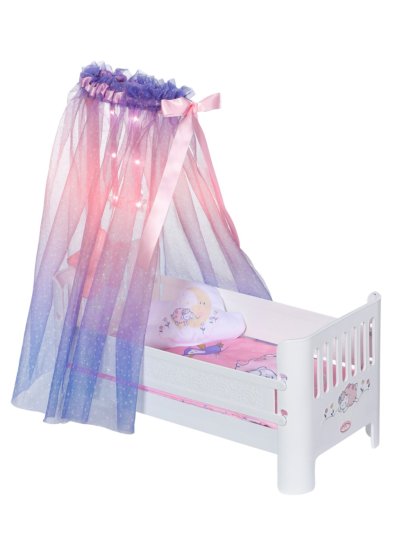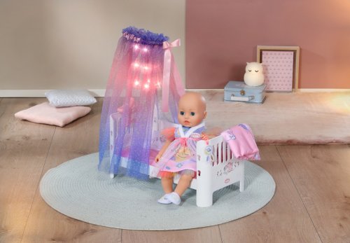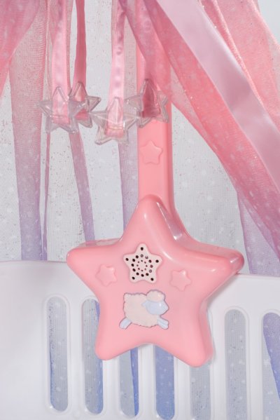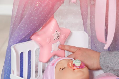 Nová postieľka Sladké sny pre bábiky Baby Annabell je skvelým miestom na spinkanie bábik. Krásna postieľka s mäkkou prikrývkou a nadýchaným obláčikovým vankúšikom hrá upokojujúcu melódiu, ktorá pomáha bábikám zaspať. Po stlačení tlačidla sa rozsvieti hviezdička, ktorá osvetlí nebesia ako by to bola skutočná obloha. Baby Annabell sa to veľmi páči. Dobrú noc, Baby Annabell! • Originálny doplnok pre bábiky Baby Annabell. • Starostlivo navrhnuté doplnky rozvíjajú detskú predstavivosť a otvárajú nové možnosti a témy hry. • Funguje na batérie (nie sú súčasťou). Baby Annabell Postieľka Sladké sny s osvetlenými nebesami as uspávankou. Súčasťou je matrac, prikrývka a vankúšik.