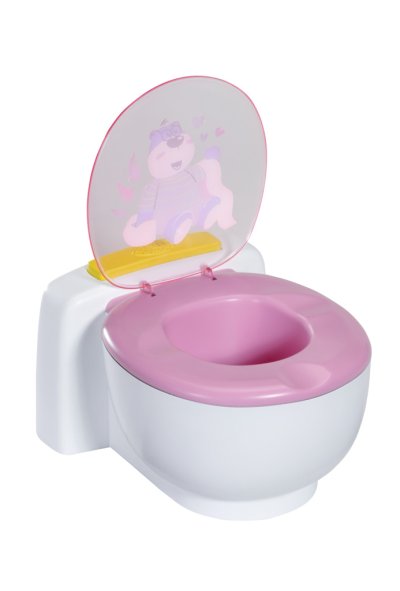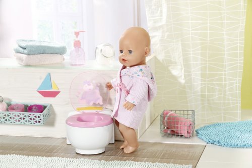 BABY born už chodí na záchod! Akonáhle sa posadí na svoj biely trón s ružovým sedadlom, začuješ zvuky cikania, potlesku a veselého smiechu. BABY born sa ale vie aj vykakať. V tom prípade sa v mise objaví farebné trblietavé kakanie. Rýchlo, je čas spláchnuť! Keď stlačíš splachovacie tlačidlo, kakanie zmizne a počuješ zvuky spláchnutia.